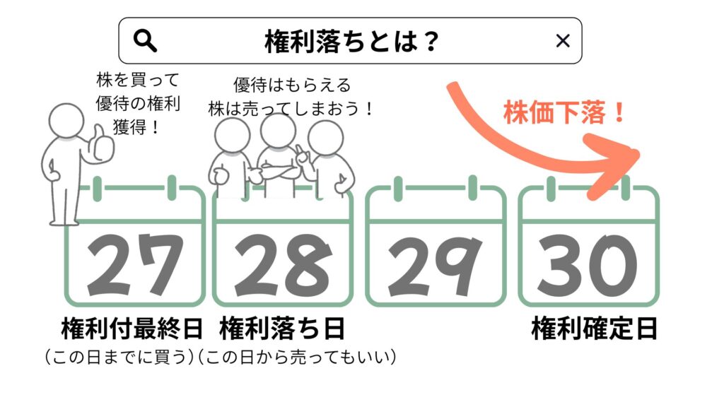 権利落ちと呼ばれ、優待の権利だけを得たい短期的な投資家が、権利確定日の翌営業日に一斉に株を売却するために起こる現象です。
